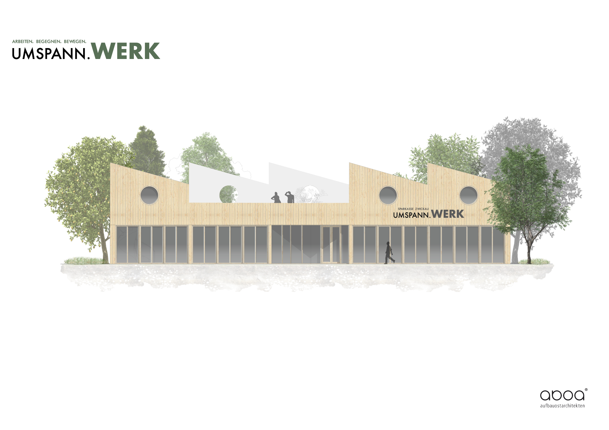 Wir freuen uns, den Wettbewerb um die Neugestaltung des ehemaligen Umspannwerks der Sparkasse Zwickau für uns entschieden zu haben. Unser Entwurf interpretiert den historischen Bestand neu und macht ihn zu einem identitätsstiftenden Ort für Begegnung, Bewegung und kreative Nutzung.Zentraler Gedanke ist die Bewahrung grauer Energie: Drei Bestandswände, der Keller und der Betonfußboden bleiben erhalten und werden mit Massivholzplatten, einem markanten Sheddach und einer transparenten Fassade ergänzt. So entsteht ein nachhaltiger "Neubau", der Vergangenheit und Zukunft verbindet.Das neue Umspann.WERK öffnet sich mit einer raumhohen Glasfassade zum grünen Innenhof der Sparkasse und bietet mit der Multi-Use-Halle, Lounge- und Dachterrassenflächen flexible Räume für Veranstaltungen, Workshops und sportliche Aktivitäten.Wir danken der Sparkasse Zwickau für das Vertrauen und freuen uns auf die weitere Zusammenarbeit bei der Umsetzung dieses besonderen Projekts!