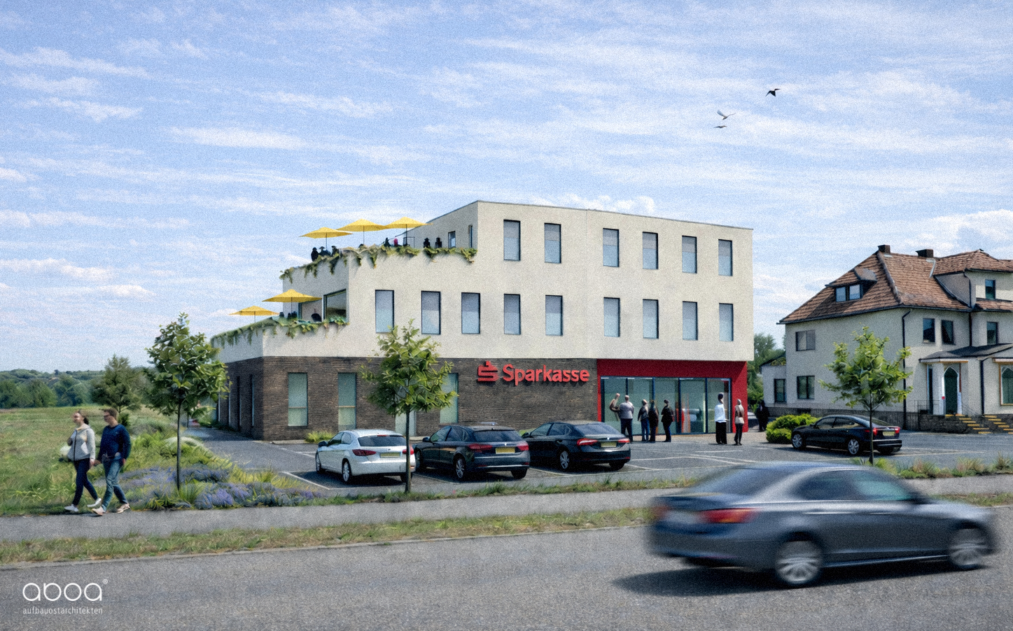 Der geplante Neubau vereint unterschiedliche Nutzungen unter einem Dach: Im Erdgeschoss entsteht eine moderne Sparkassenfiliale mit Service- und Beratungsbereichen, während in den Obergeschossen eine Gewerbeeinheit sowie Flächen für insgesamt vier Wohnungen vorgesehen sind.